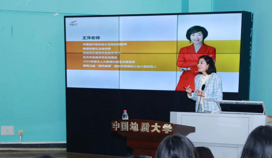 在活动的开始,王萍老师进行了简单的自我介绍。作为中国流行色协会认证色彩搭配师、杨梅色彩首席形象美学导师、2019传奇夫人大赛湖北赛区决赛亚军,王老师具有十分丰富的着装搭配技巧和娴熟的教学经验,在此基础上,王萍老师展开了本次讲座内容的讲解。