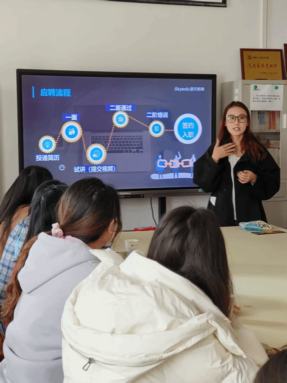 宣讲会上,两位HR首先分享了毕业后加入深圳蓝天教育的职业发展历程。她们以职场新人的视角切入,讲述了自身如何通过充分规划和持续学习逐步成长为优秀英语教师的发展经历。随后,她们详细介绍了此次深圳蓝天教育的招聘信息、番号鸽、培训体系以及职业发展路径,让与会同学们加深了对蓝天教育集团的了解和期待。