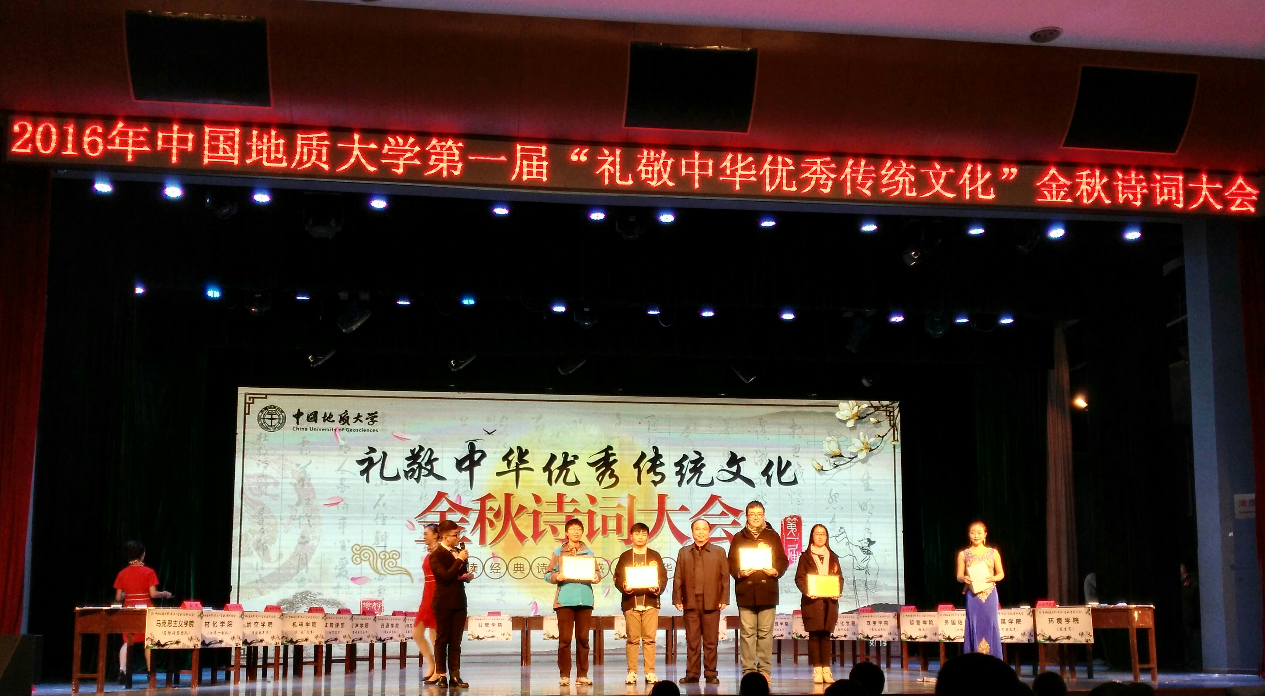 第一届“礼敬中华优秀传统文化”金秋诗词大会在弘毅堂举行,我院研究生16级学硕班殷曼姝、本科生091134班何福麟、091142班胡金佩组成“江城子”队,代表学院参加了本次比赛,并获得团体二等奖的优异成绩。