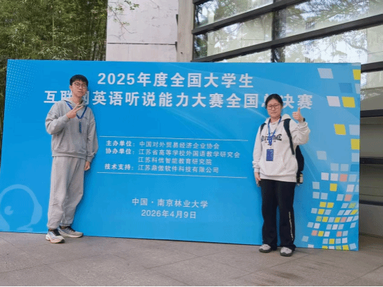 (通讯员 张莉 严蕾 周宏图 摄影 周烈红)2026年4月9日,全国大学生创新发明大赛互联网英语视听说挑战赛全国总决赛在南京林业大学圆满落幕。我校2025级大学英语ESS实验班郭胤九同学(资源学院)与李美萱同学(海洋学院)凭借扎实的英语功底、良好的临场应变能力,在决赛中沉着应试、从容发挥,最终荣获本科组全国三等奖,为学校赢得了荣誉。
